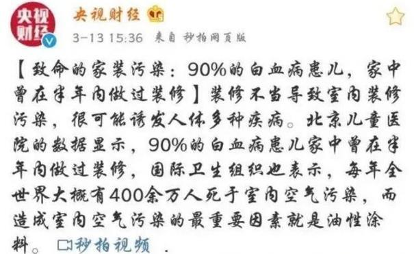 據(jù)央視報(bào)道,根據(jù)北京兒童醫(yī)院的數(shù)據(jù)顯示,90%的白血病患兒家中曾在半年內(nèi)做過裝修。事實(shí)上,人們每天平均有2/3的時(shí)間在室內(nèi)度過,室內(nèi)環(huán)境污染對(duì)兒童、孕婦的損害更為嚴(yán)重。在房子裝修過程中,地面、墻面裝飾材料是最大污染源之一。